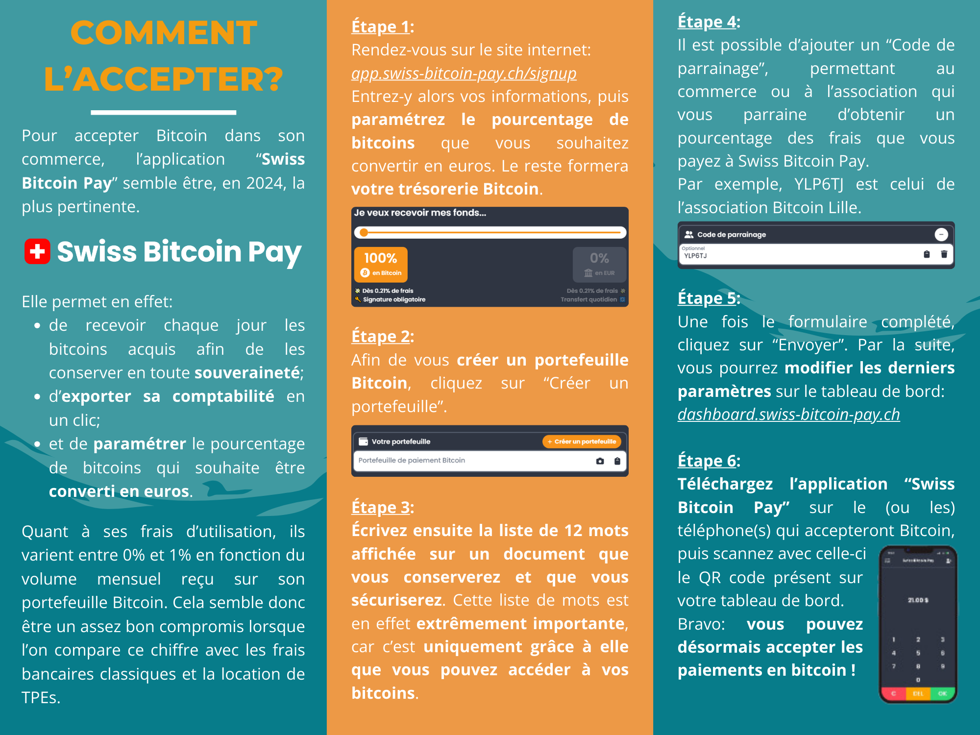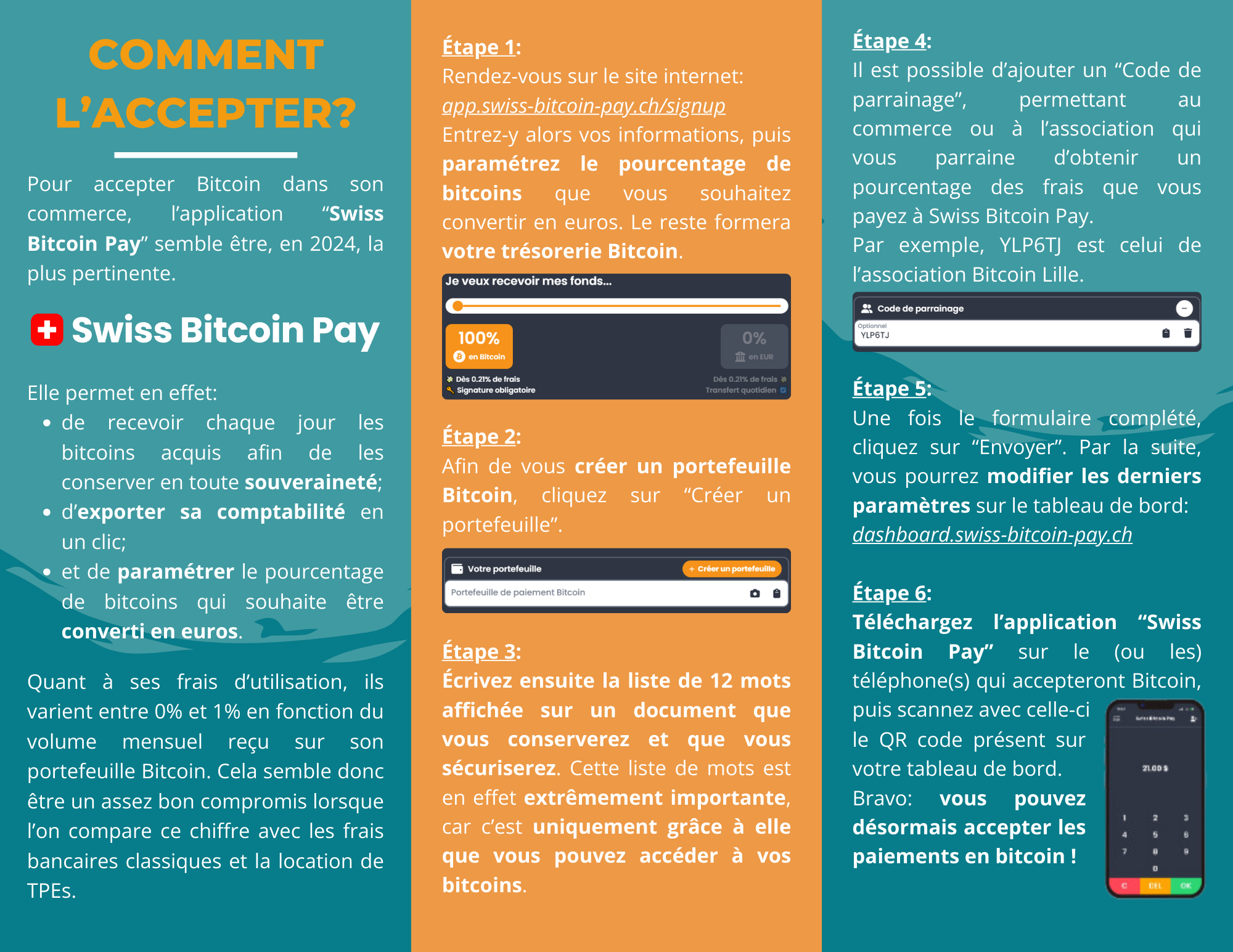 Il existe de nombreuses solutions simples et intuitives permettant d’accepter Bitcoin sans difficulté. Parmi elles, l’application “Swiss Bitcoin Pay” semble être la plus pertinente pour débuter. Elle permet en effet: